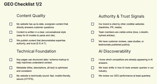 Get a free Q3 2025 GEO Readiness Checklist to find out if your brand is ready to appear in responses from ChatGPT, Gemini, and other generative AI engines.